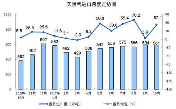 天然氣進口快速增長。10月份,進口天然氣581萬噸,同比增長52.1%,增速比9月份加快48.2個百分點。1-10月份,進口天然氣5416萬噸,同比增長24.9%。