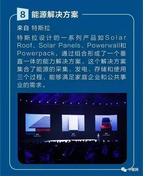 烏鎮峰會上是如此介紹特斯拉獲獎理由的:“特斯拉垂直整合能源解決方案集合了能源采集發電、能源儲存和使用三個過程。該方案可形成家用、商用及公用發電儲能系統,從而提高電網的可靠性和效率,降低企業和居民的能源成本,并提供能量后備供應。”