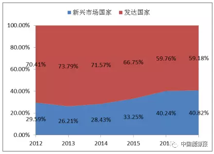 △ 圖6 2012-2017 “500強”企業中新興市場國家與發達國家企業總營業收入占比