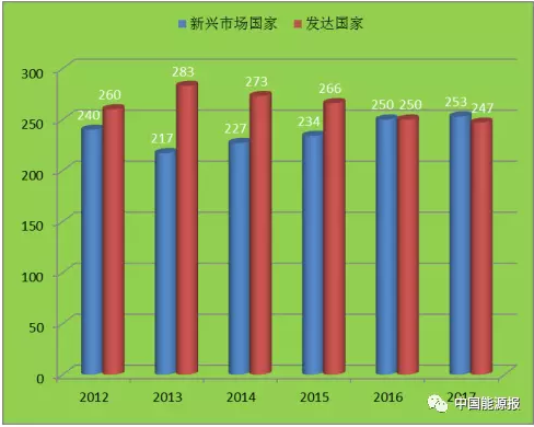 △ 圖5 2012-2017“500強”企業中新興市場國家與發達國家企業總營業收入(億元)