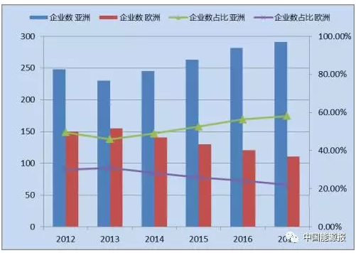 自2015全球新能源企業“500強”首次在入圍的企業數和其總營業收入額上被亞洲全面超越后,歐洲近兩年的新能源產業發展每況愈下,今年更是近乎停滯不前。