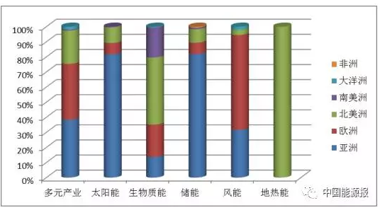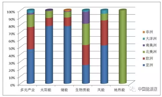 2017全球新能源企業500強產業發展的地域特征十分明顯。表1給出了2017“500強”企業的產業洲際分布情況。由表中可以看出,從企業數上看,多元產業企業主要分布在亞洲、歐洲和北美洲;太陽能企業則主要在亞洲;儲能企業也主要是在亞洲;生物質能企業則相對均衡,主要分布在北美洲、歐洲、亞洲和南美洲;風能企業主要在亞洲、歐洲;而地熱能企業則主要在北美洲。圖10則更清晰的展示了這一點。