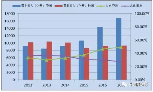 △ 圖8 2012-2017“500強”亞洲、歐洲企業營業收入及其占比對比