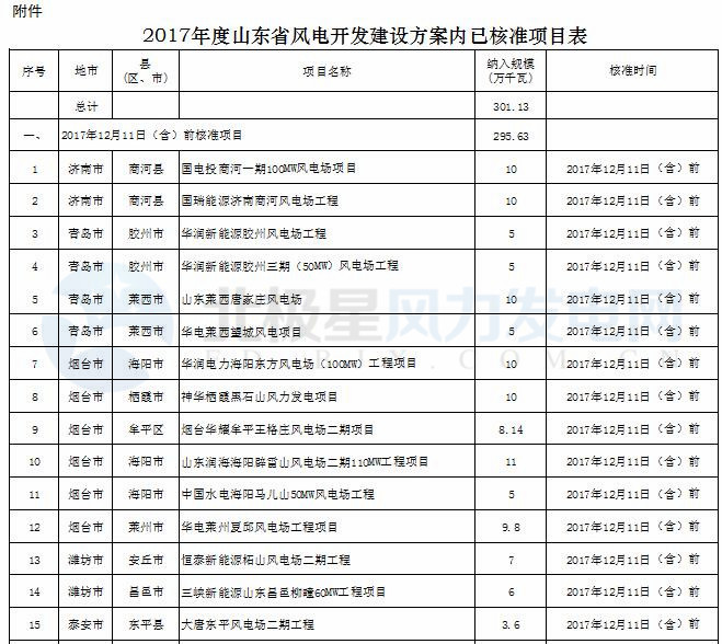 附件:2017年度山東省風電開發建設方案內已核準項目表