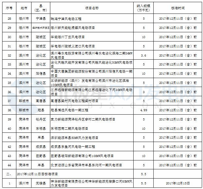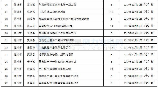 2017年度山東省風電開發建設方案項目核準情況公示(截止12月17日)