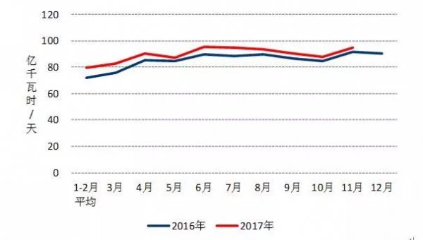 1-11月份,全國制造業用電量29658億千瓦時,同比增長6.0%,增速比上年同期提高3.9個百分點。11月份,全國制造業用電量2849億千瓦時,同比增長3.7%;制造業日均用電量95.0億千瓦時/天,分別比上年同期和上月增加3.4億千瓦時/天和7.0億千瓦時/天。