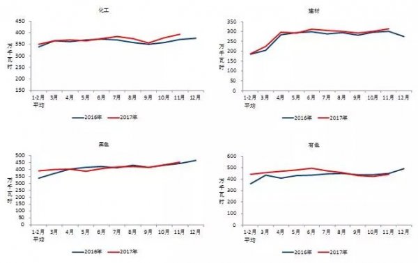 1-11月份,化學原料制品、非金屬礦物制品、黑色金屬冶煉和有色金屬冶煉四大高載能行業用電量合計16565億千瓦時,同比增長4.3%,增速比上年同期提高5.2個百分點;合計用電量占全社會用電量的比重為28.9%,對全社會用電量增長的貢獻率為19.7%。其中,化工行業用電量4057億千瓦時,同比增長4.4%,增速比上年同期提高3.2個百分點;建材行業用電量3016億千瓦時,同比增長3.6%,增速比上年同期提高1.2個百分點;黑色金屬冶煉行業用電量4497億千瓦時,同比增長1.4%,增速比上年同期提高6.4個百分點;有色金屬冶煉行業4994億千瓦時,同比增長7.5%,增速比上年同期提高8.0個百分點。