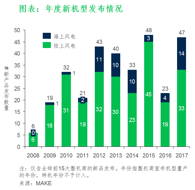 隨著業內對風電LCOE的關注以及開發商對新一代大型風機的需求增長,風機整機商面臨著巨大壓力,比以往更頻繁地推出新款風機產品。新機型的開發,或是在現有風機機型基礎上通過風機增容或加大葉輪直徑的方式創新,或是開發全新的風機平臺。以下圖表對比了2016、2017年度新機型發布情況。其中很大一部分的產品發布是針對中國市場推出的2MW低風速風機平臺及初代3MW風機平臺。與此同時,西方整機商也大量推出了全新的4MW機型。海上風電市場同樣新增了大量風機產品,尤其是在中國市場,有望以此迎接未來海上風電市場的快速發展。