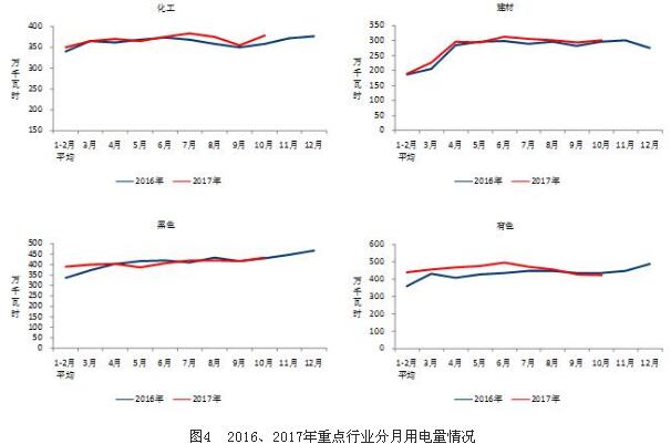 1-10月份,化學原料制品、非金屬礦物制品、黑色金屬冶煉和有色金屬冶煉四大高載能行業用電量合計14962億千瓦時,同比增長4.5%,增速比上年同期提高6.0個百分點;合計用電量占全社會用電量的比重為28.8%,對全社會用電量增長的貢獻率為19.9%。其中,化工行業用電量3664億千瓦時,同比增長4.1%,增速比上年同期提高2.6個百分點;建材行業用電量2702億千瓦時,同比增長3.5%,增速比上年同期提高1.7個百分點;黑色金屬冶煉行業用電量4044億千瓦時,同比增長1.4%,增速比上年同期提高7.6個百分點;有色金屬冶煉行業4552億千瓦時,同比增長8.5%,增速比上年同期提高9.7個百分點。