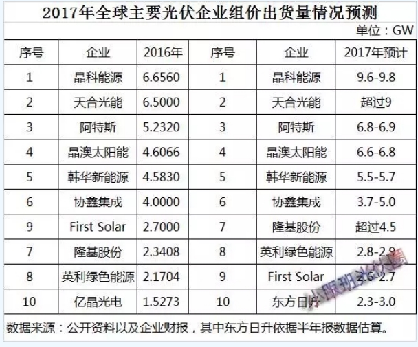 整體來看,2017年全球主要光伏企業(yè)組件出貨量排名無明顯變動,晶科、天合光能、阿特斯、晶澳太陽能和韓華新能源將進一步鞏固前五的位置;隆基股份和英利綠色能源則有望超過FirstSolar,排名略有上移。