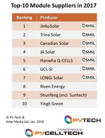 值得一提的是,1月15日PVTech也公布了2017年全球光伏組件出貨量排名,具體如下: