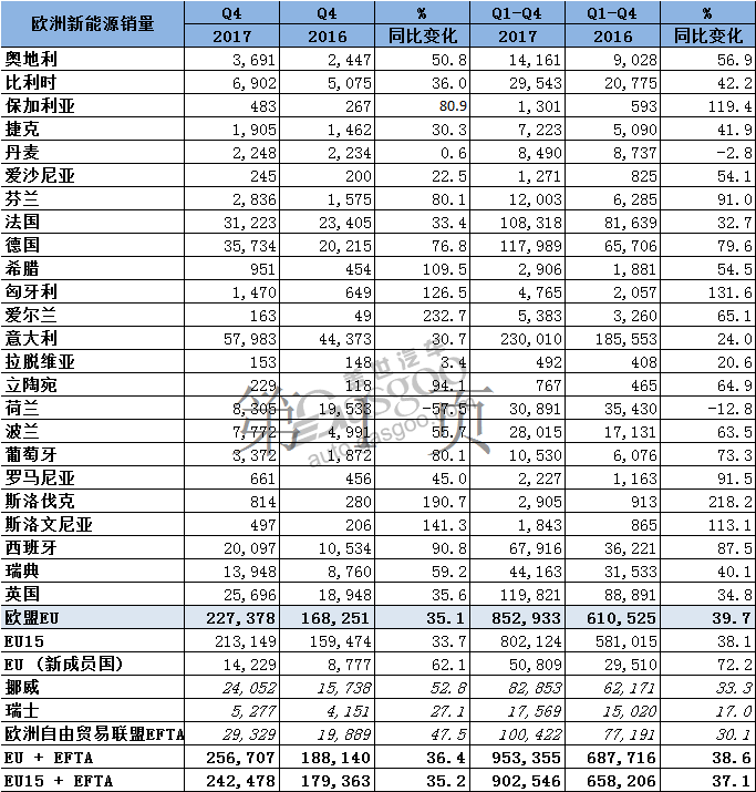據歐洲汽車制造協會(ACEA)公布的數據顯示,2017年第四季度,歐盟地區新能源汽車的需求量繼續保持增長,同比增幅達到35.1%,總計售出227,378輛,在整個乘用車銷量當中的占比達到6.7%。
