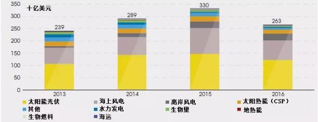 2013—2016年全球可再生能源不同技術類型的年度投資