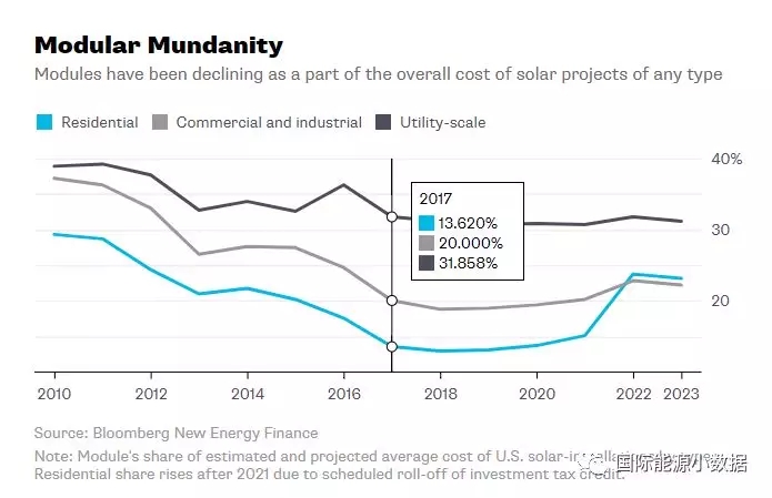 值得注意的是,光伏組件只是光伏系統的一部分。以大型地面光伏電站為例,2010年光伏組件占系統成本的38.8%,而2017年這一比例為31.8%;BNEF預計2023年光伏組件將占地面大型光伏電站總成本的31.2%,與2017年相比沒有明顯變化。對于屋頂光伏而言,2010年光伏組件占系統成本的29.3%,而2017年這一比例跌至13.6%;BNEF預計2023年光伏組件將占屋頂光伏總成本的的23.2%。