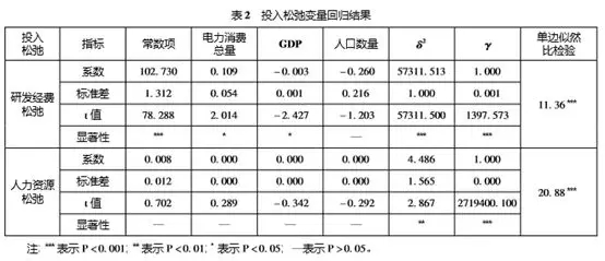 電力消費總量對研發經費投入的松弛變量具有正向影響,說明電力消費總量較大但也并不能有效增加行業內創新資源的配置。原因在于,盡管行業的消費需求量很大,帶動了政府對行業創新給予較多的資金支持,但是獲得資金支持的企業可能對研究經費的管理較為粗放,造成浪費。國內生產總值和人口數量對研究經費松弛變量的影響為負,說明經濟實力的強度可以有效增進光伏行業創新資源的配置。電力消費總量、人口和GDP對于人力資源投入的松弛變量的影響并不顯著。