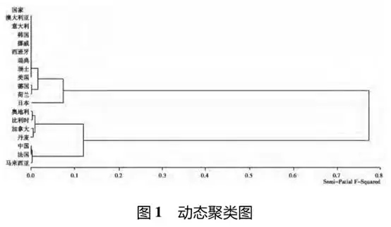 (3)聚類分析將樣本國家分為三類,第一類:澳大利亞、美國、德國和日本等11個國家,光伏產業政策效率處于相對較高的水平;第二類為中國、法國和馬來西亞,光伏產業政策效率處于相對中等的水平;第三類為奧地利、比利時、加拿大和丹麥,光伏產業政策效率處于相對較低的水平。