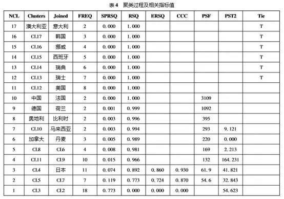 表4中,NCL為當前系統存在類的總個數,Clusters為當前加入的編號,Joined表示加入該類的國家,FREQ表示新類的元素個數,SPRSQ表示類與類之間規格化最短距離,RSQ表示R2統計量,ERSQ表示偏R2統計量,CCC為統計量值,PSF為偽F統計量,PST2為偽T2統計量,Tie表示“節”。從CCC統計量可以看出,聚為3類時的值最大;若聚為4類,偽F統計量PSF和偽T2統計量都變化較大。綜合各方面的情況,聚為3類最為合適。