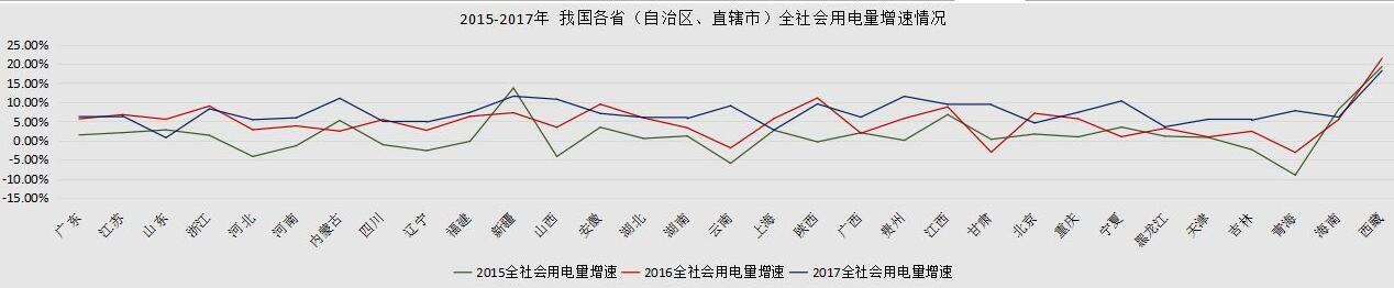 從全社會用電量增速上看,2017年,我國各個省(自治區(qū)、直轄市)全社會用電量已經(jīng)出現(xiàn)全面增長的局面。