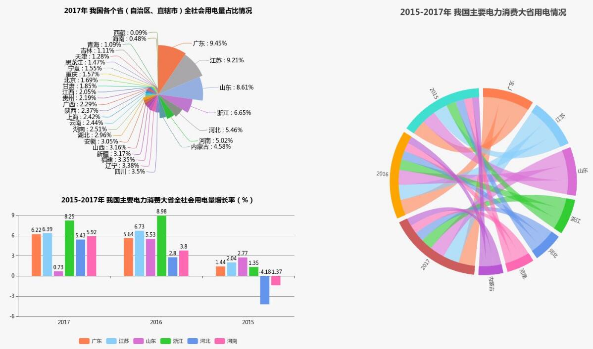 2017年,東部、南方地區(qū)依然是我國主要的經(jīng)濟區(qū),廣東、江蘇、山東、浙江GDP超過50000億元4個經(jīng)濟大省,同時全社會用電量也居于全國前四位,四個省份綜合占我國全社會用電量的33.9%,與去年同期相比下降了0.1個百分點。