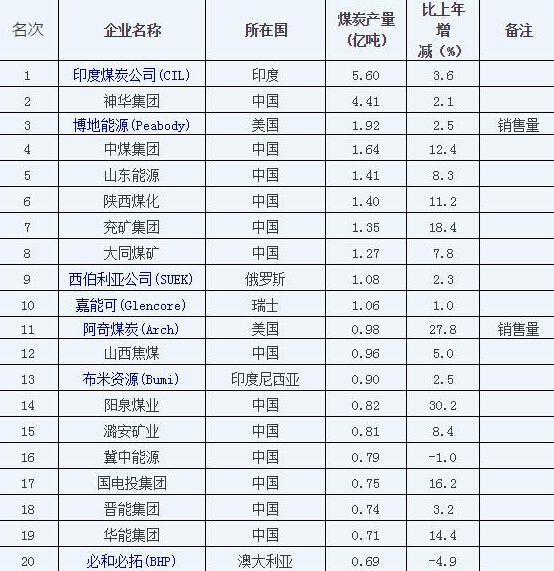 按照目前公布的2017年世界主要國家煤炭企業(yè)煤炭產(chǎn)量初步統(tǒng)計數(shù)據(jù),全球前20家煤炭企業(yè)產(chǎn)量排名如下: