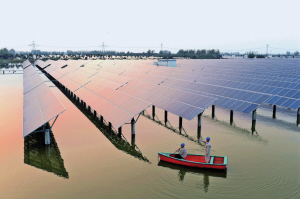 江蘇鹽城建湖縣供電公司員工到全國首個漁光互補光伏電站協助基地巡檢設備。肖兵 攝
