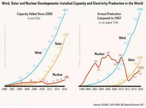 近年來,核能在發電量尤其是新增裝機容量上,都遠遠不及風能和太陽能。來源:《世界核能產業發展報告》