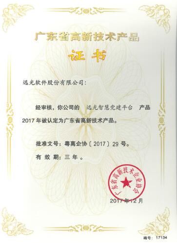 近日,由遠光軟件自主研發的“遠光智慧黨建平臺”順利通過廣東省高新技術企業協會認定,獲頒發2017年度“廣東省高新技術產品”證書。