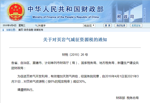 財政部、稅務總局近日發布《關于對頁巖氣減征資源稅的通知》,為促進頁巖氣開發利用,有效增加天然氣供給,經國務院同意,自2018年4月1日至2021年3月31日,對頁巖氣資源稅(按6%的規定稅率)減征30%。