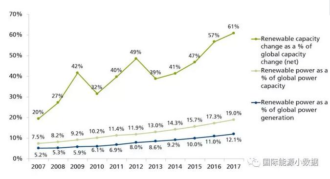 雖然2017年新增裝機的比例高達61%,但是當年在全球發電總裝機容量中占19.0%,而發電量僅占12.1%。