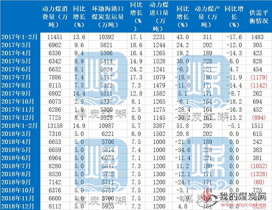 對于2018年,我們是這樣推測的,第一,假設區域內動力煤產量與2017年維持不變。即便1-2月份區域內動力煤產量同比再度下降了5.1%,我們仍然假設后面月份原煤產量同比維持不變。如果持續減少,只能導致區域內煤炭供應進一步收縮。第二,假設動力煤進口總量與2017年維持不變。在這一假設基礎上,考慮到1-3月份進口量同比大幅增長,后面月份進口量自然會減少。第三,根據西煤東運鐵路運能情況,我們假設3月份之后環渤海港口每月煤炭發運量同比增加400萬噸左右。第四,我們假設3月份之后區域內動力煤消費量每月同比增長5%。