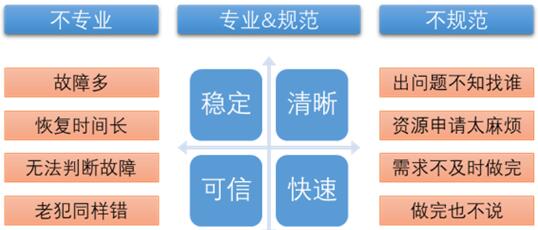 隨著業(yè)務發(fā)展,運維的非專業(yè)性問題開始凸顯,這時候運維強調(diào)專業(yè)分工和運維作業(yè)規(guī)范且利用工具進行業(yè)務調(diào)度,滿足運維的方便透明、快速響應、過程預警及質(zhì)量監(jiān)督的管理需求。