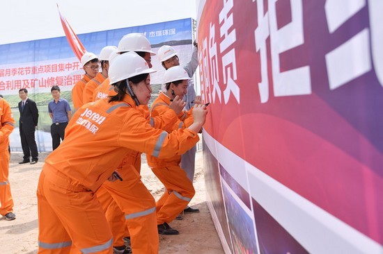 柞村鎮黨委書記楊棟、柞村鎮鎮長邱維興、全國綠色礦山聯盟理事長杜根杰、杰瑞環保集團董事長王丕學、杰瑞集團高級副總裁李雪峰、杰瑞設計院院長楊波出席項目開工儀式并為項目奠基。
