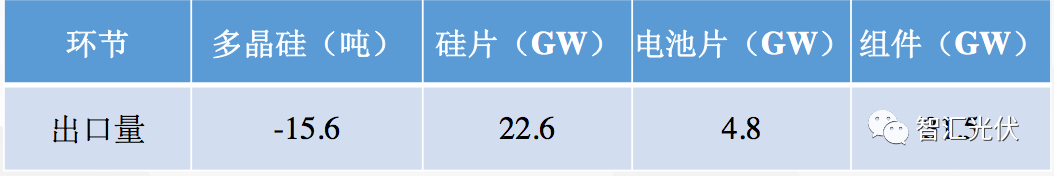 根據(jù)中國光伏行業(yè)協(xié)會(huì)的數(shù)據(jù),2017年,各環(huán)節(jié)的出口量如下表所示。