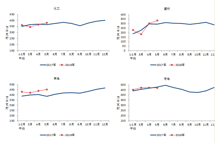 5月份,四大高載能行業(yè)用電量合計(jì)1633億千瓦時(shí),同比增長8.6%,占全社會用電量的比重為29.5%。其中,化工行業(yè)用電量379億千瓦時(shí),同比增長6.7%;建材行業(yè)用電量334億千瓦時(shí),同比增長14.6%;黑色金屬行業(yè)用電量452億千瓦時(shí),同比增長18.6%;有色金屬冶煉行業(yè)469億千瓦時(shí),同比下降1.6%。