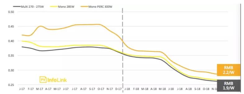 2017-18年組件歷史價格與預測(Unit: US$/W),來源:PV InfoLink