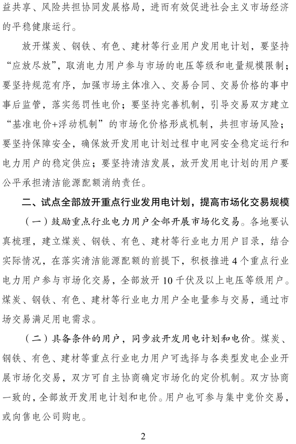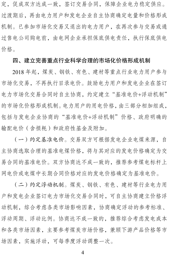 (六)2018年放開煤炭、鋼鐵、有色、建材等4個行業電力用戶發用電計劃,全電量參與交易,通過市場化交易滿足用電需求,建立市場化價格形成機制。具體實施方案見附件。