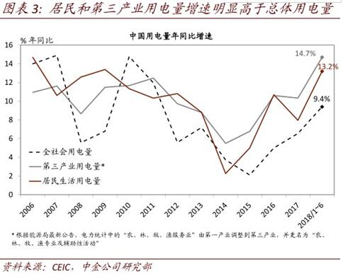 為何用電量增長(zhǎng)持續(xù)超預(yù)期?我們認(rèn)為,這與中國(guó)目前特有的發(fā)展階段以及能源消費(fèi)結(jié)構(gòu)的快速轉(zhuǎn)變有關(guān),同時(shí)也受到環(huán)保相關(guān)政策的影響。分行業(yè)來(lái)看,居民用電和第三產(chǎn)業(yè)電耗的增速明顯超出總體水平(圖表3)。