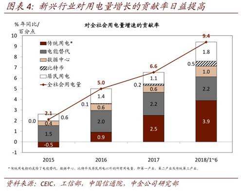 此外,鑒于中國(guó)目前的服務(wù)器滲透率仍然較低(中國(guó)目前服務(wù)器的保有量為美國(guó)的三分之二左右,人均更低)而大數(shù)據(jù)在中國(guó)的發(fā)展仍在較早期階段,中國(guó)信通院預(yù)測(cè),未來(lái)3年服務(wù)器數(shù)量有望保持30%以上的增長(zhǎng),對(duì)整體用電量增速的貢獻(xiàn)率在每年1~1.2個(gè)百分點(diǎn)左右。另一方面,我們估算2018年部分“灰色行業(yè)”(如比特幣挖礦)的電耗對(duì)整體用電增長(zhǎng)的貢獻(xiàn)也達(dá)到0.5個(gè)百分點(diǎn)左右。