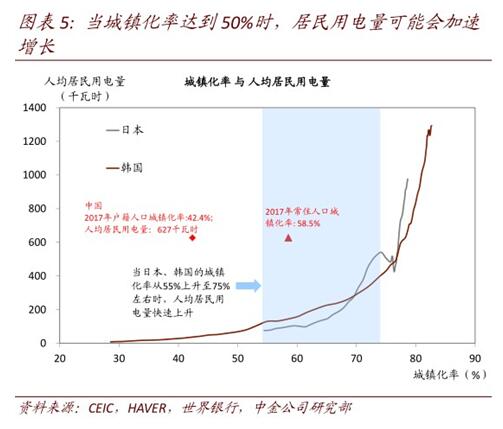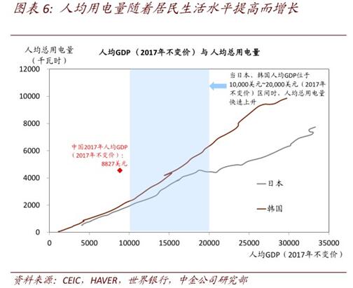 此外,相比歷史數(shù)據(jù),現(xiàn)今消費(fèi)電子產(chǎn)品快速的滲透可能進(jìn)一步推高居民用電的潛力。參照韓國(guó)和日本在城鎮(zhèn)化率和人均GDP與中國(guó)水平相當(dāng)時(shí)的經(jīng)驗(yàn)來(lái)看,我們預(yù)計(jì)未來(lái)幾年中國(guó)居民用電增速將保持在均年均10%左右的水平。
