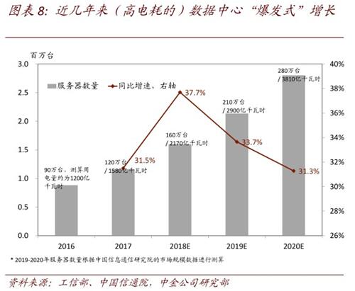 根據(jù)工信部統(tǒng)計(jì),2017年中國(guó)的服務(wù)器數(shù)量同比增長(zhǎng)32%,2018年1-6月同比增長(zhǎng)38%;我們估算這些高耗電的數(shù)據(jù)中心在2016年的用電量約為1200億度,2017年則接近1600億度。基于2018年服務(wù)器數(shù)量同比增長(zhǎng)約38%的假設(shè),全年數(shù)據(jù)中心用電量可能會(huì)接近2200億度的水平,對(duì)整體用電量貢獻(xiàn)率約為1.0個(gè)百分點(diǎn)(圖表4和8)。