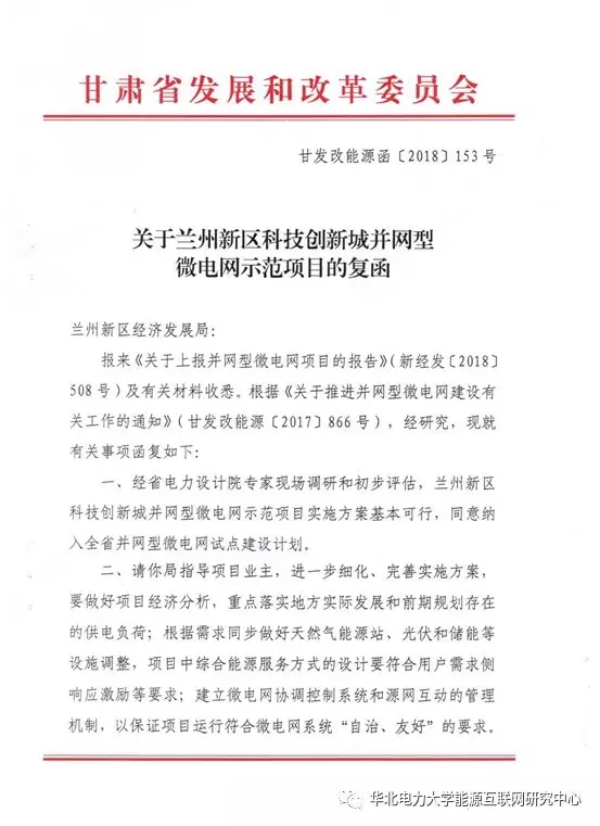 7月23日,甘肅省發(fā)展和改革委員會下發(fā)《關于蘭州新區(qū)科技創(chuàng)新城并網(wǎng)型微電網(wǎng)示范項目的復函》(甘發(fā)改能源函〔2018〕153號),批復同意蘭州新區(qū)科技創(chuàng)新城并網(wǎng)型微電網(wǎng)示范項目實施方案,并納入甘肅省并網(wǎng)型微電網(wǎng)試點建設計劃。此批復文件的下發(fā)標志著蘭州新區(qū)科技創(chuàng)新城項目取得重要實質(zhì)性突破,該項目實施方案由華北電力大學能源互聯(lián)網(wǎng)研究中心負責編制。