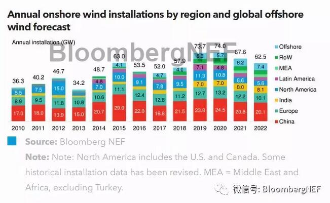 陸上風電長期預測(2023到2030年):我們預計,全球陸上風電裝機將達到70GW到103GW之間。我們的預測是基于《新能源市場長期展望》(NEO),即彭博新能源財經針對電力領域的長期展望報告做出的。這一分析基于當前政策正常實施,但2020年后沒有新的政策支持,且符合最低電力成本優化的原則,即在每個國家以最低成本建設不同發電技術,以滿足尖峰及平均用電需求,以及極端天氣的影響。