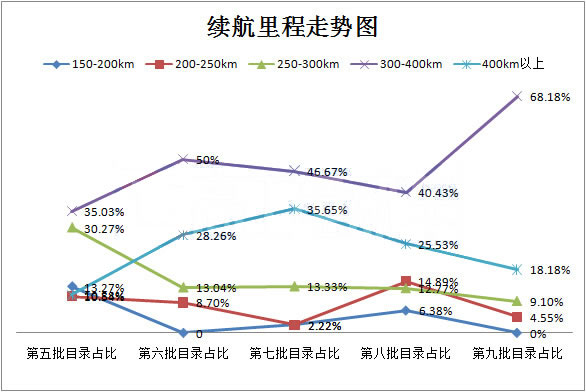 其中,在每批推薦目錄中占比最多的是續(xù)航里程在300-400km范圍內(nèi)的車(chē)型,其占比由第5批的35.03%提升至第9批的68.18%,其次是400公里以上的車(chē)型;而200公里以下的車(chē)型由13.27%下降至0。