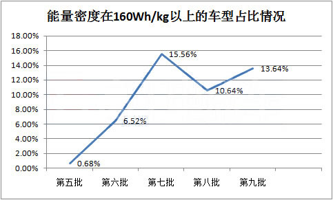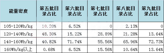 而在近幾批推薦目錄中,眾車(chē)企繼續(xù)發(fā)力高額補(bǔ)貼,能量密度160Wh/kg以上的車(chē)型逐漸增多,由第五批推薦目錄的0.68%,提升至了15.56%。在第7批到第9批目錄中,能量密度在160Wh/kg以上的車(chē)型占比均維持在10%以上,這些車(chē)型均可以拿到1.2倍補(bǔ)貼。