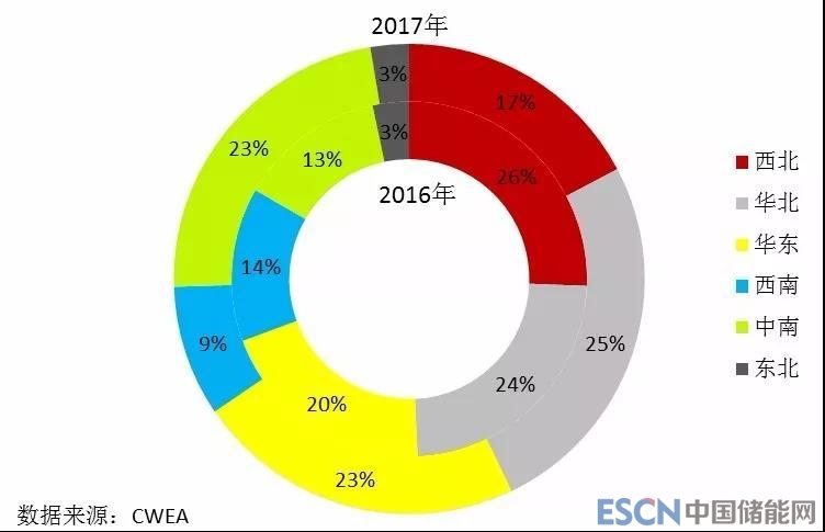 圖2 2016年和2017年中國各區域新增風電裝機容量占比情況