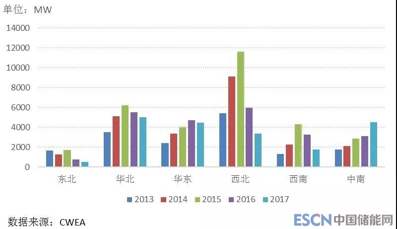 圖3 2013年至2017年中國各區域新增風電裝機容量趨勢