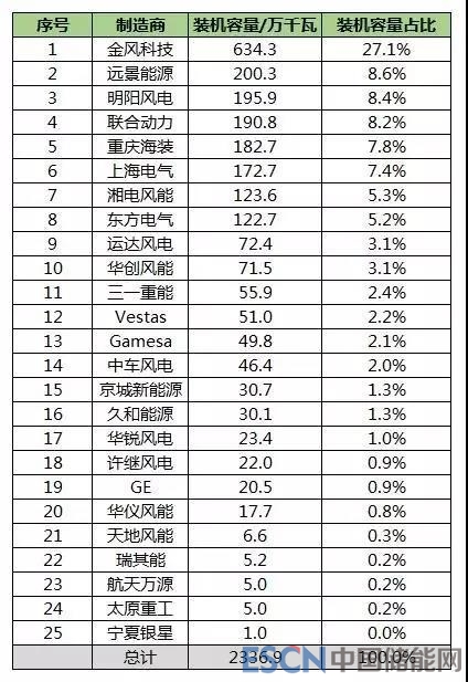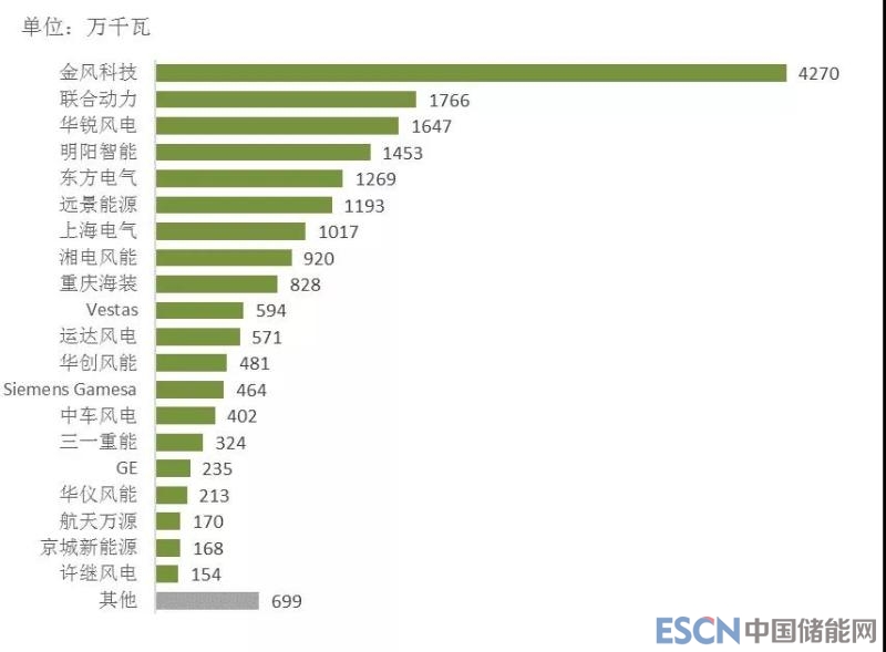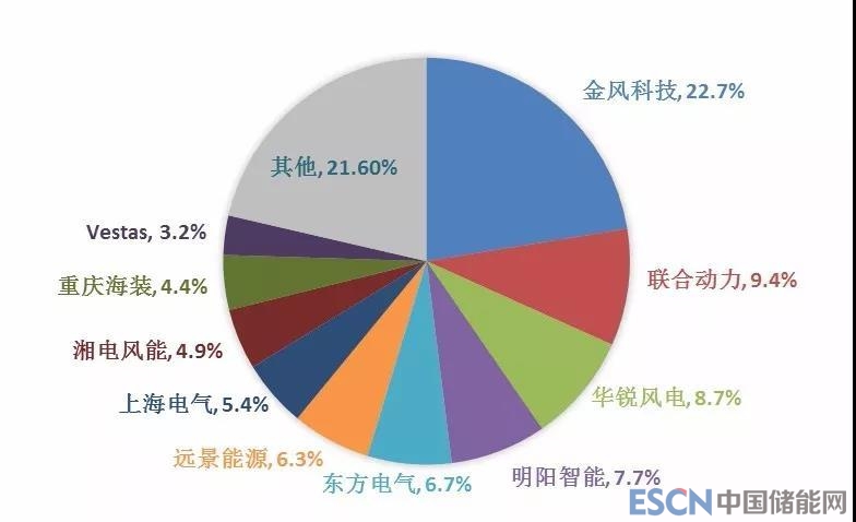2017年,中國風電統計有新增裝機的整機制造企業共22家,新增裝機容量1966萬千瓦,其中,金風科技新增裝機容量達到523萬千瓦,市場份額達到26.6%;其次為遠景能源、明陽智能、聯合動力和中國海裝,前五家市場份額合計達到67%。