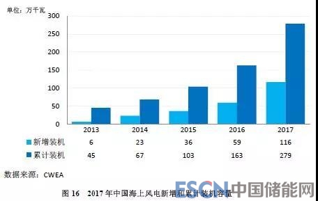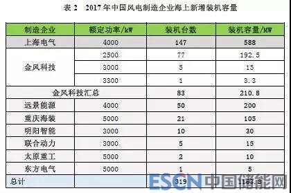 2017年,中國海上風電取得突破進展,新增裝機共319臺,新增裝機容量達到116萬千瓦,同比增長97%;累計裝機達到279萬千瓦。2017年共有8家制造企業有新增裝機,其中,上海電氣新增裝機容量最多,共吊裝147臺,容量為58.8萬千瓦,占比達到50.5%。