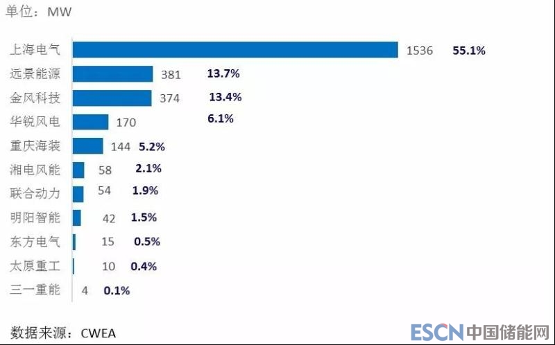 截至2017年底,海上風電機組整機制造企業共11家,其中,累計裝機容量達到15萬千瓦以上有上海電氣、遠景能源、金風科技、華銳風電,這4家企業海上風電機組累計裝機量占海上風電總裝機容量的88%,上海電氣以55%的市場份額遙遙領先。