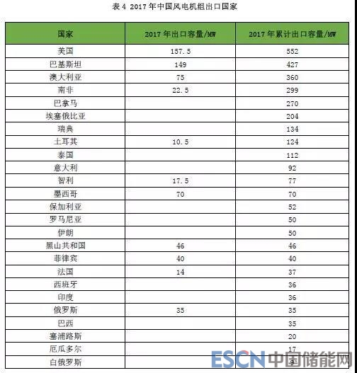 2017年,中國向國外出口風電機組311臺,容量641MW,同比增長21%。截至2017年底,中國風電機組制造企業已出口的風電機組共計1707臺,累計容量達到3205MW。